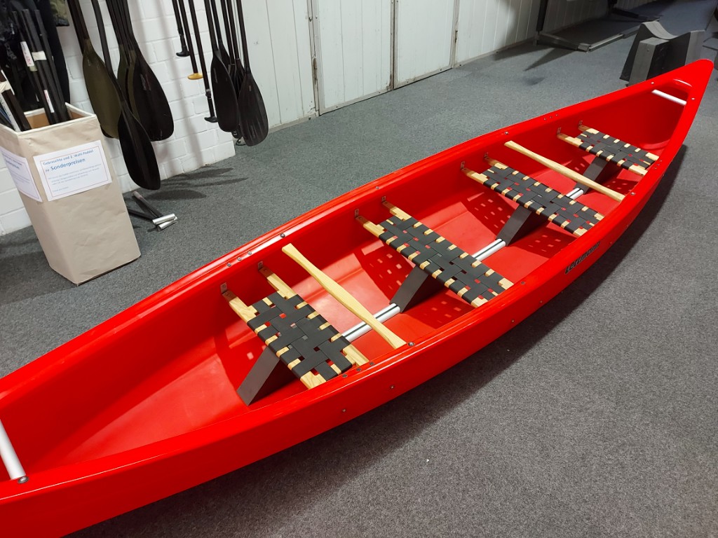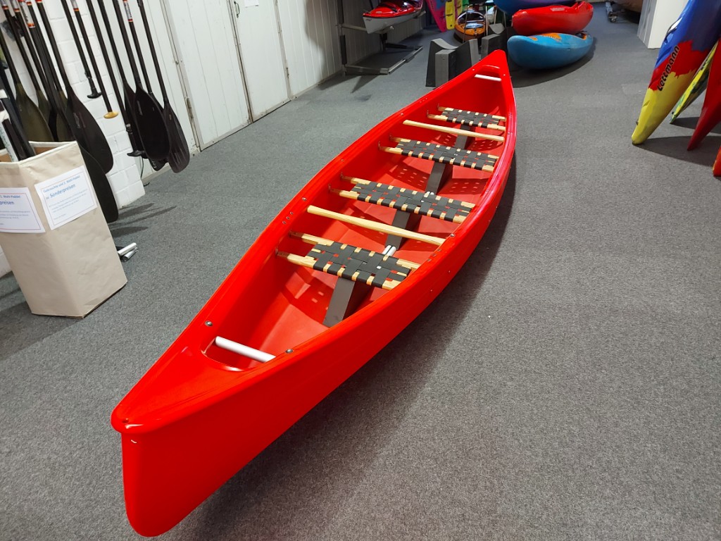 Mehr Boot für weniger Geld: Bei diesem roten Canadier handelt es sich um eine neues Boot mit leichten Lagersprugen. Durch seine einlagige Bauweise kann es auch auf flachen Gewässern gefahren werden.