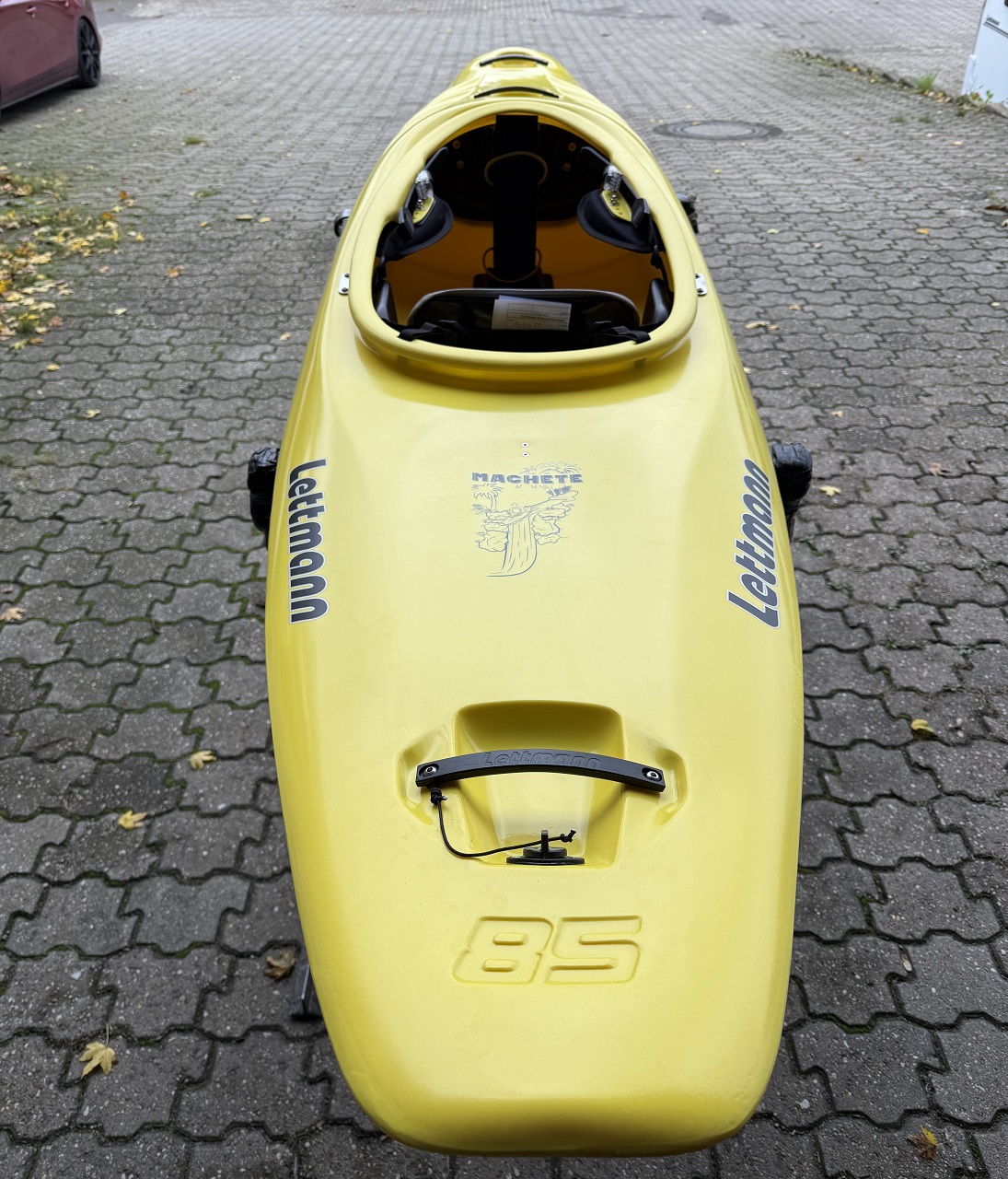 Die Machete reiht sich in die moderne Klasse der Half-Slice-Kajaks ein. Und doch sticht sie aus der Masse hervor. Denn kein Half-Slicer ist so kompromisslos konstruiert. Wir gehen voran mit einem nie da gewesenen Rockerprofil, welches der Machete ein enorm kontrolliertes Auftauchverhalten bescherrt. Dabei ist das Heck „more slicey“ und erlaubt stundenlanges pirouettieren. Wie sich diese beiden Gegensätze im Wildwasser zu einem so kontrollierten und verzeihenden Fahrverhalten kombinieren lassen? Darauf gibt es eine einfache Antwort: Die Machete ist von vorne bis hinten mit einem breiten, flachen Unterschiff gesegnet. So flippert sie über Walzen und Wellen hinweg und ist sofort nach der Landung nach Stufen, Walzen und Abfällen wieder voll unter Kontrolle. Elegant und spielerisch auf leichten Strecken, voll unter Kontrolle auch im schweren Wildwasser. Dafür steht die Machete wie kein anderes Kajak.
