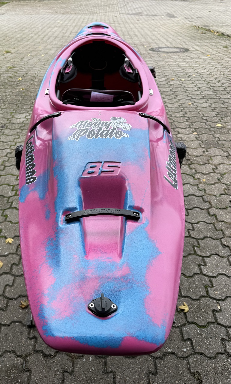 Flacher Boden, harte Kante: die Machete lässt grüßen. Ebenso der Bugrocker. Aber: Etwas mehr Rocker vorne und ordentlich mehr Volumen hinter dem Cockpit machen den THP im dicken Wasser und nach Stufen sicherer und lassen dich noch trockener Boofen und Skippen. Apropros Boofen: Das war ja noch nie so leicht! Das Heck mit seiner machetenscharfen Kante schneidet ins Wasser wie das Buschmesser durch die Liane. Das zentrale Volumen-Paket am Heck schießt dich dann von der Abrisskante ins All - wenn du es denn willst. Dieser Creeker ist extrem leicht zu kontrollieren und deutlich sensibler, als es auf den ersten Blick scheint. Kurskorrekturen aus voller Fahrt, schnell mal übers Heck drehen, all das haben wir uns mit unserem Half-Slice angewöhnt. Und darauf müssen und wollen wir auch beim Creeker nicht mehr verzichten! Voilà - „The Horny Potato“, die Antwort auf deine schlaflosen Nächte.